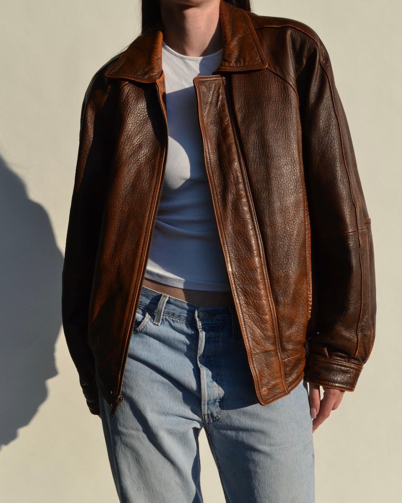 - Brown distressed leather bomber jacket