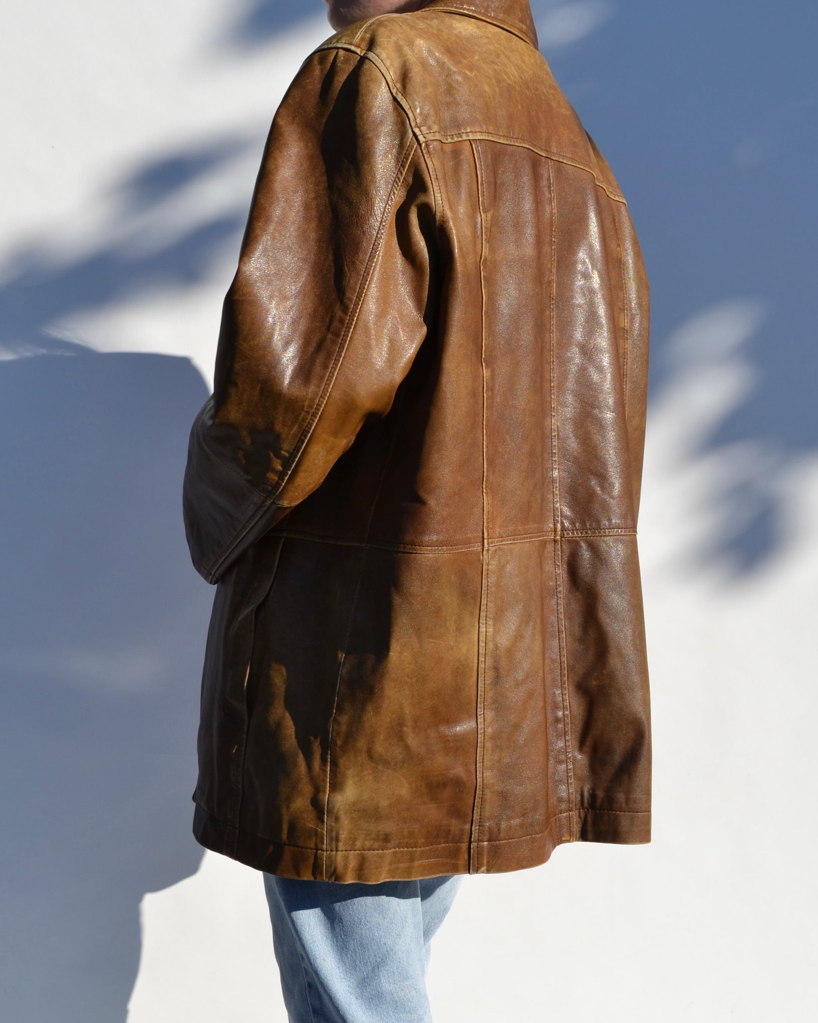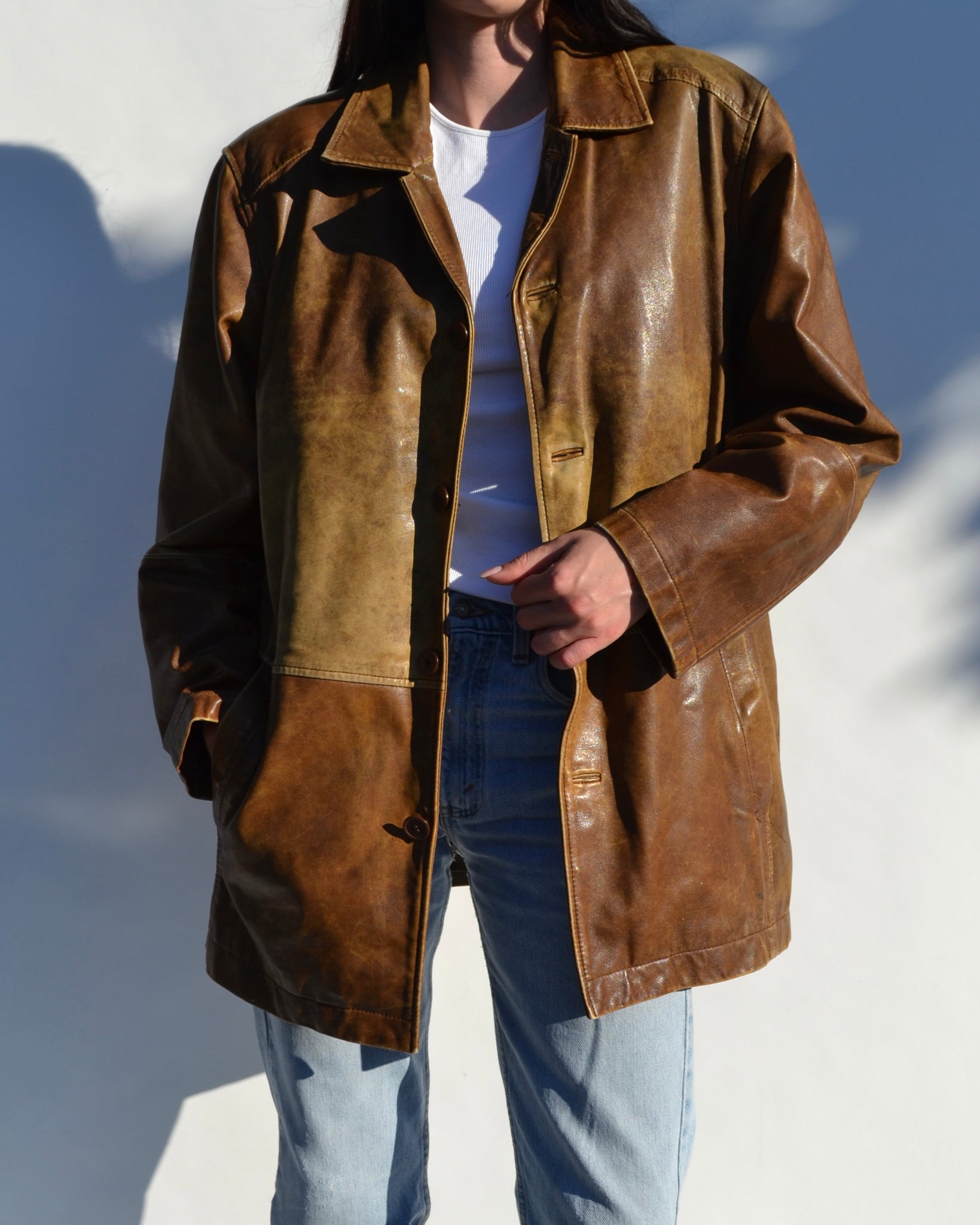 Vintage Danier tan distressed four button jacket. Features zip out lining, button up closure, and front hand pockets.
