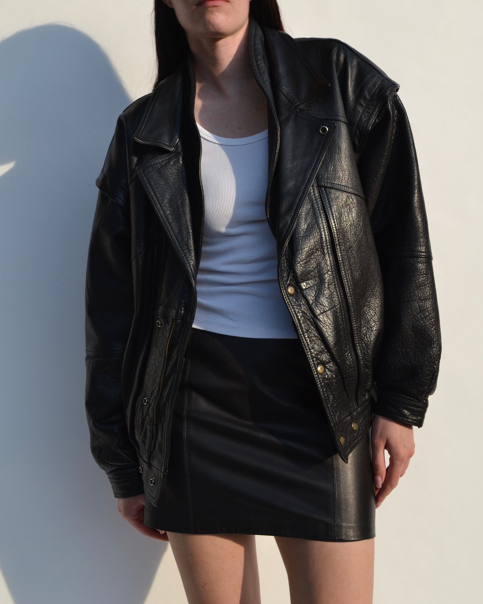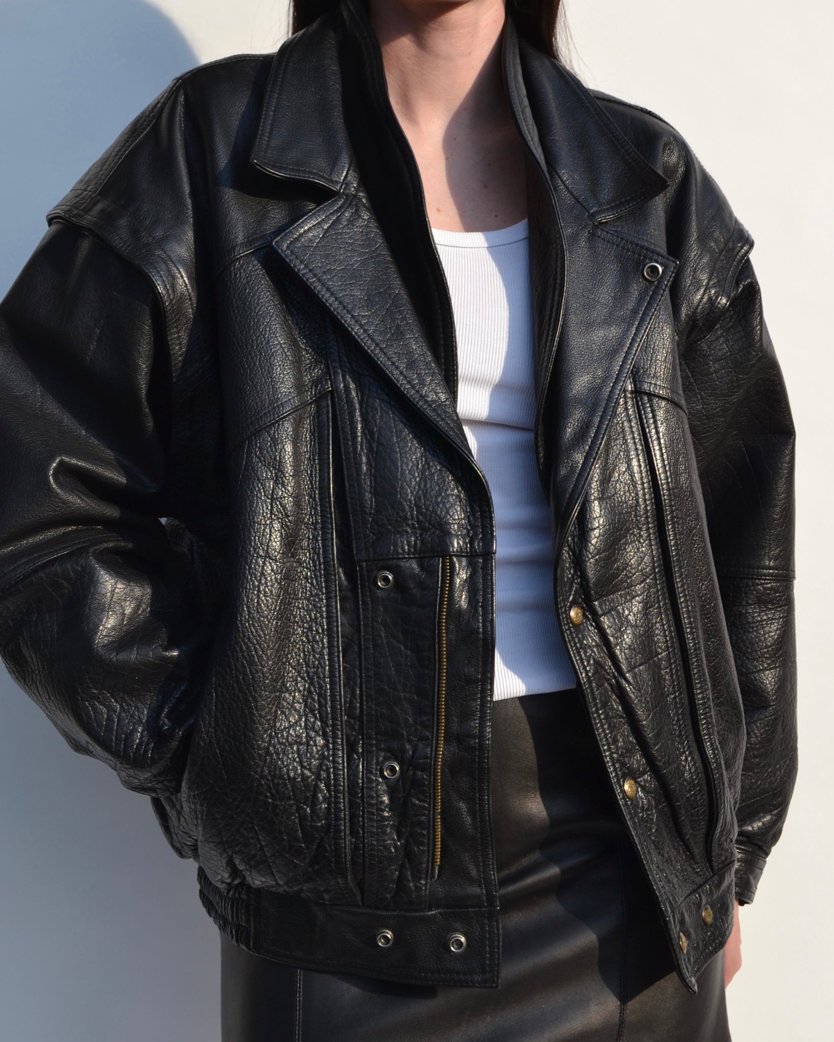 Vintage black pebbled leather jacket. Elasticized waistband, layered collar, and snap front closure with zipper.